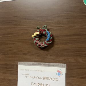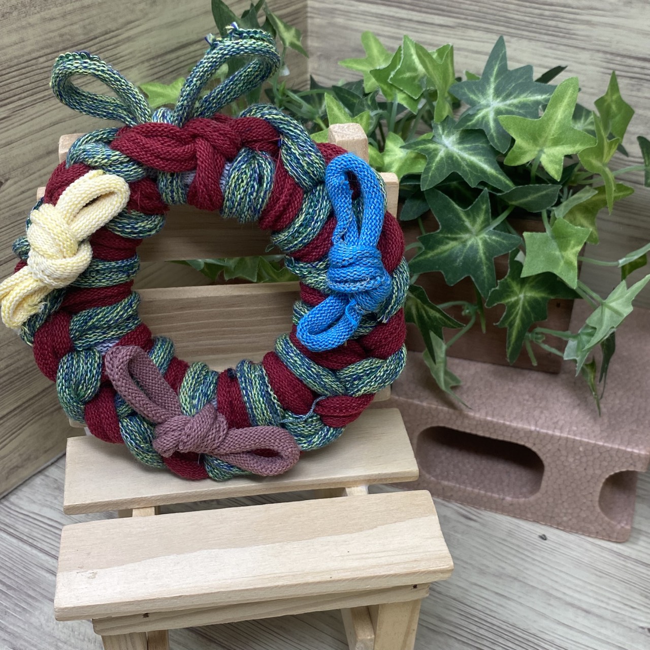 その準備に向けて、「クリスマスリース」を作りました。材料のすべてが靴下わっかで作っていて