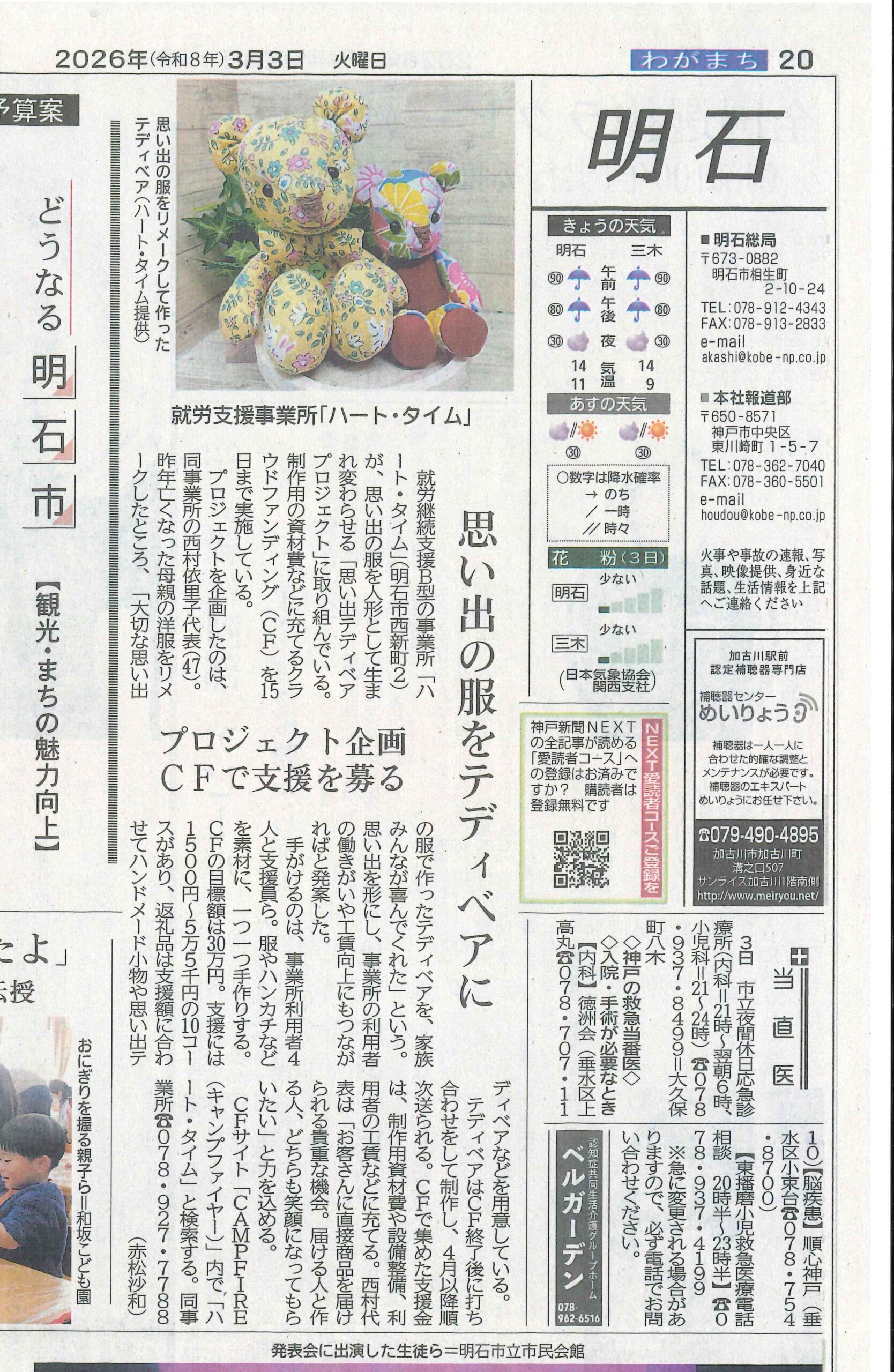 このたび「思い出テディベアプロジェクト」が 神戸新聞様 に掲載されました。