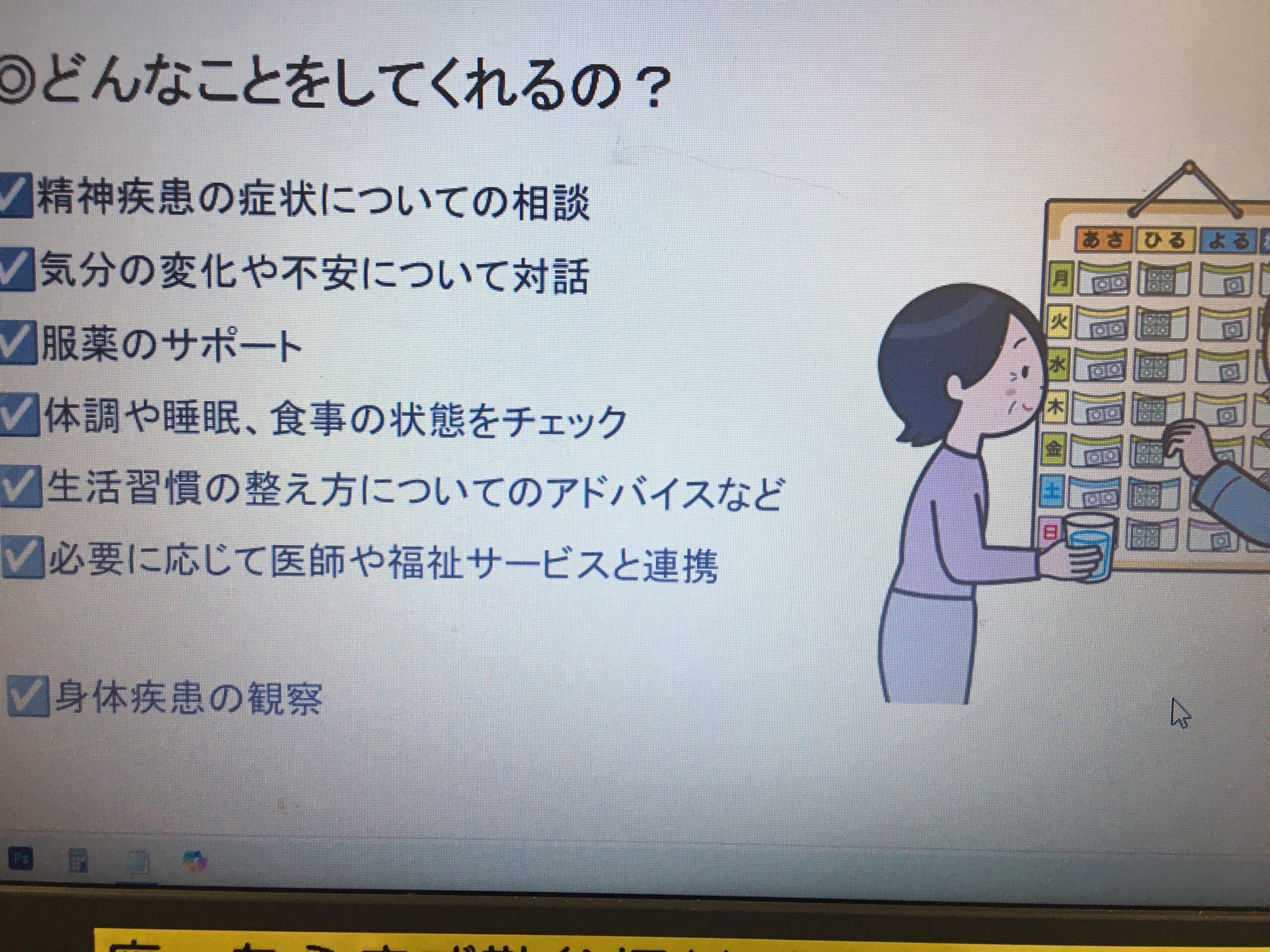 オアシスでは精神科訪問看護をしていて、訪問看護のメリットやどんなことをしてくれるの?どんな人が利用できるの?費用は?など分かりやすく資料をもとに説明をしてくださいました。