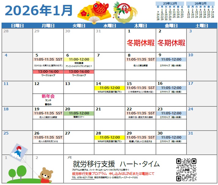 1月12日(月/祝)は事業所で新年会を開催いたします。ランチを食べたり、書初めも行う予定です\(^o^)/